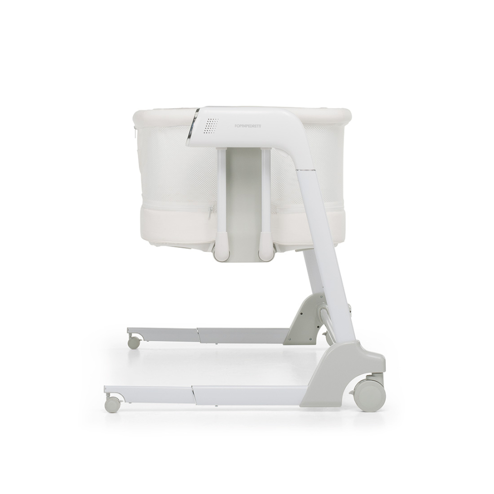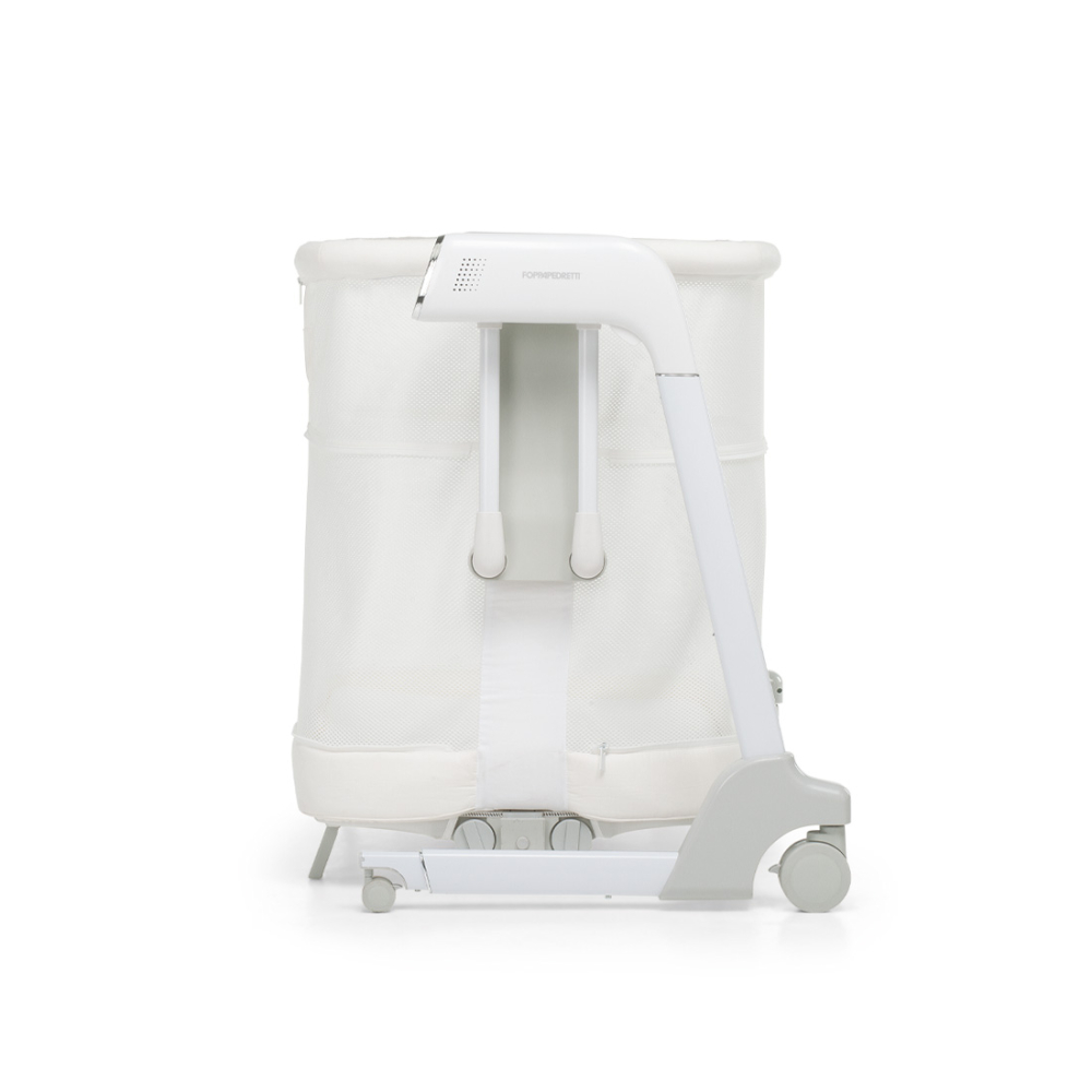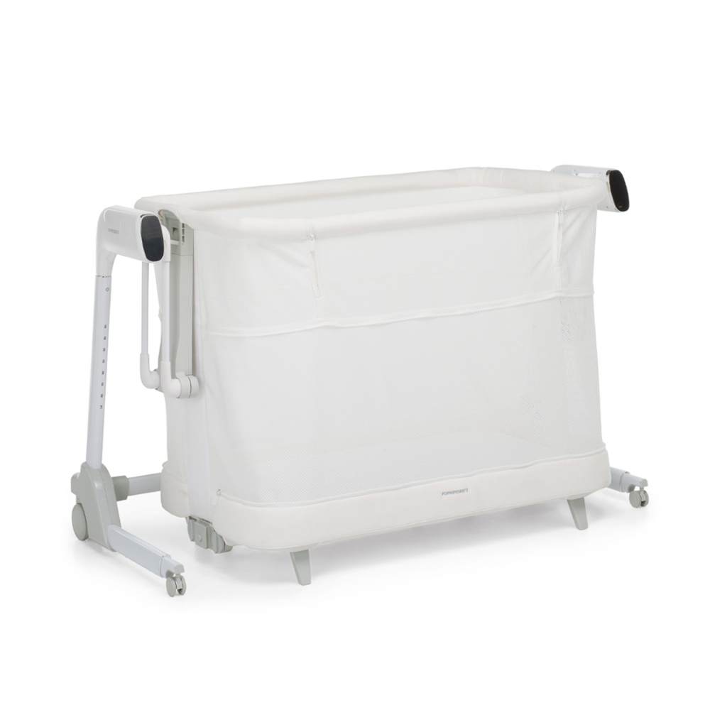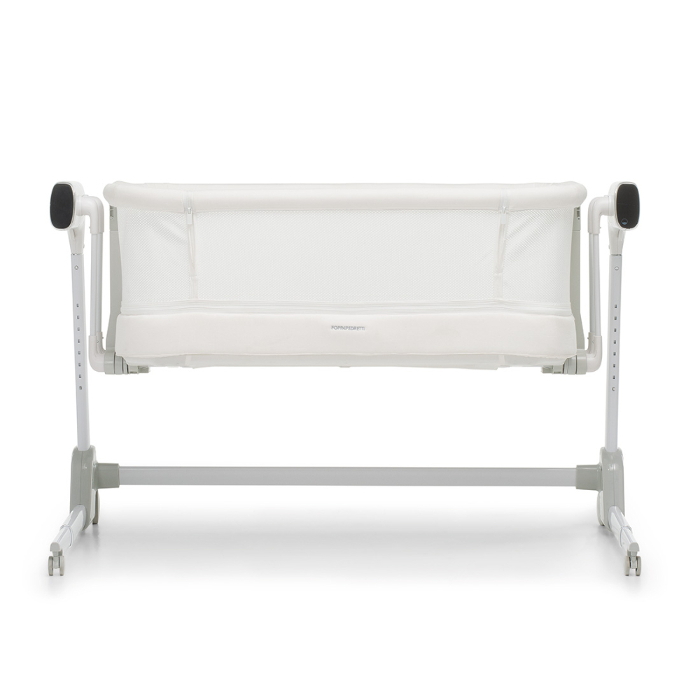 La versione co-sleeping, con fianco apribile e utilizzabile dalla nascita fino a 9 kg di peso, è regolabile in altezza in 8 posizioni, con funzione anti reflusso. Il dispositivo a dondolo con 5 velocità e scelta di 23 melodie musicali con display touch screen o telecomando in dotazione si attiva anche con il rilevamento pianto del bambino. Ha tessuto a rete per garantire un’ottimale areazione e dispositivo per il bloccaggio del movimento oscillatorio. Ha doppia alimentazione a batteria o a corrente.