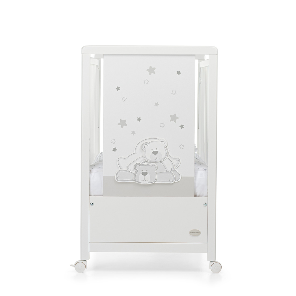 Pikkoletto si affianca comodamente al letto dei genitori e ha una sponda regolabile a due altezze, per facilitare il riordino del lettino, che può anche essere abbassata per la versione a divanetto (terminato l’uso come lettino).