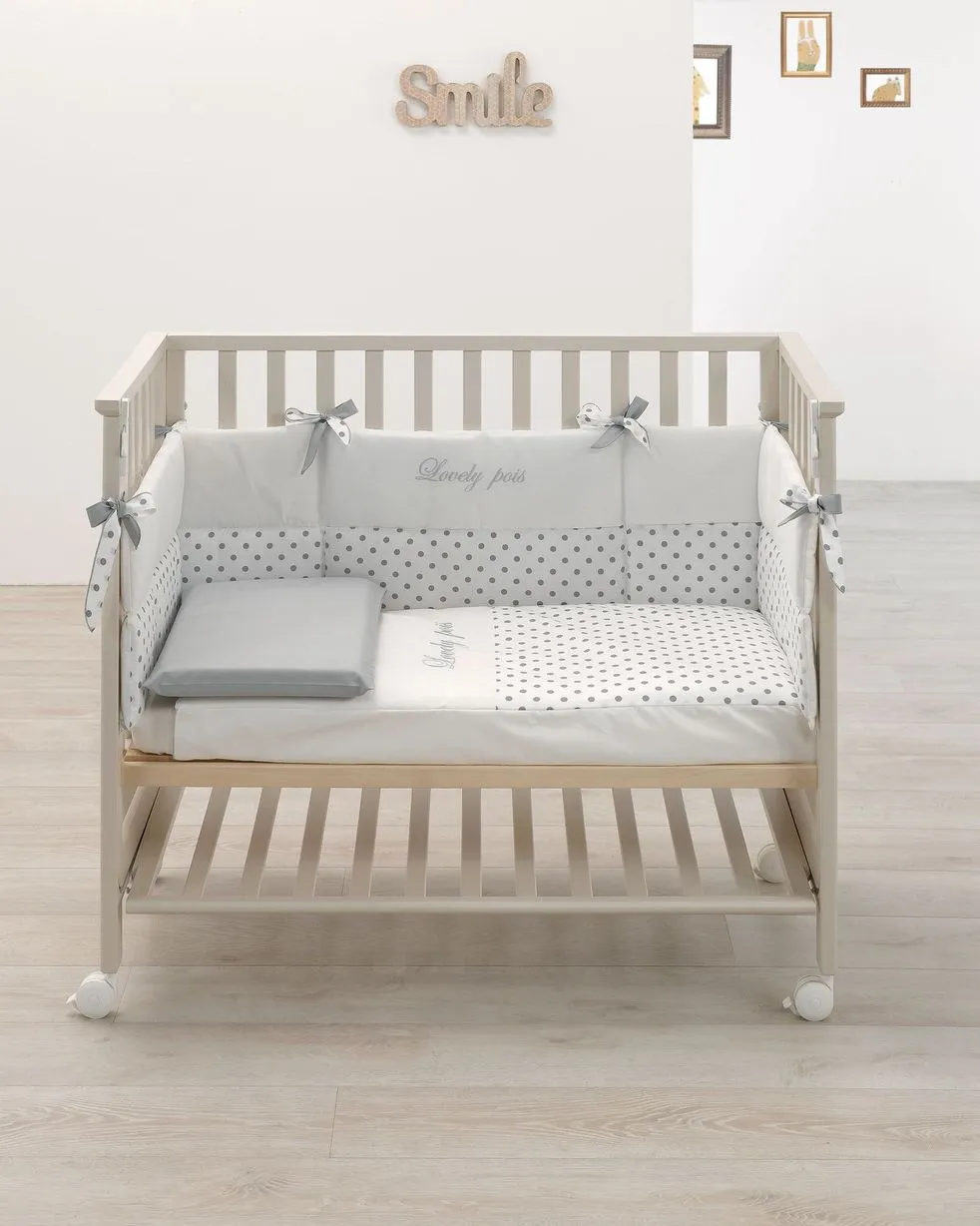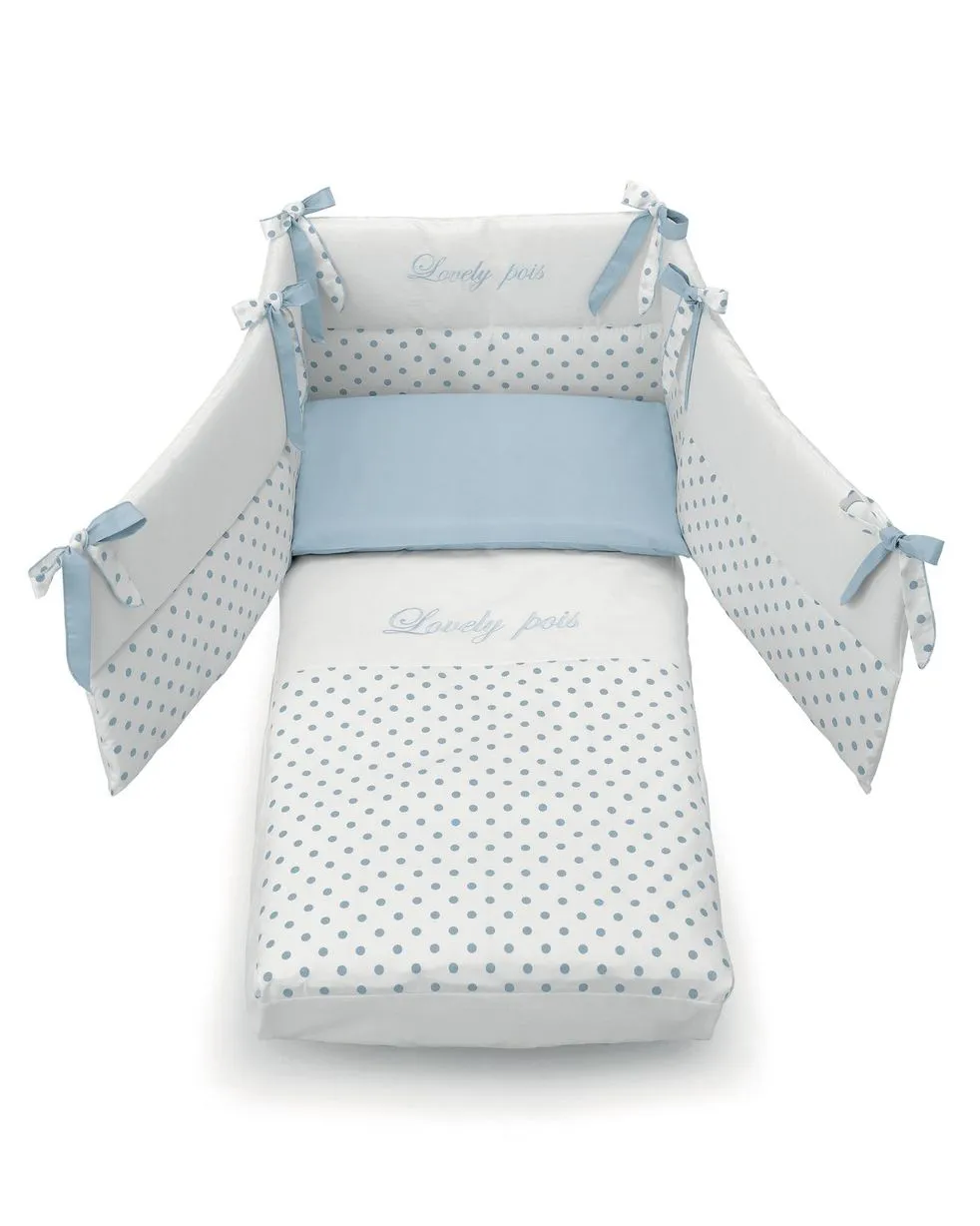 Il completo è realizzato in tessuto 100 cotone con ricami e stampe a pois